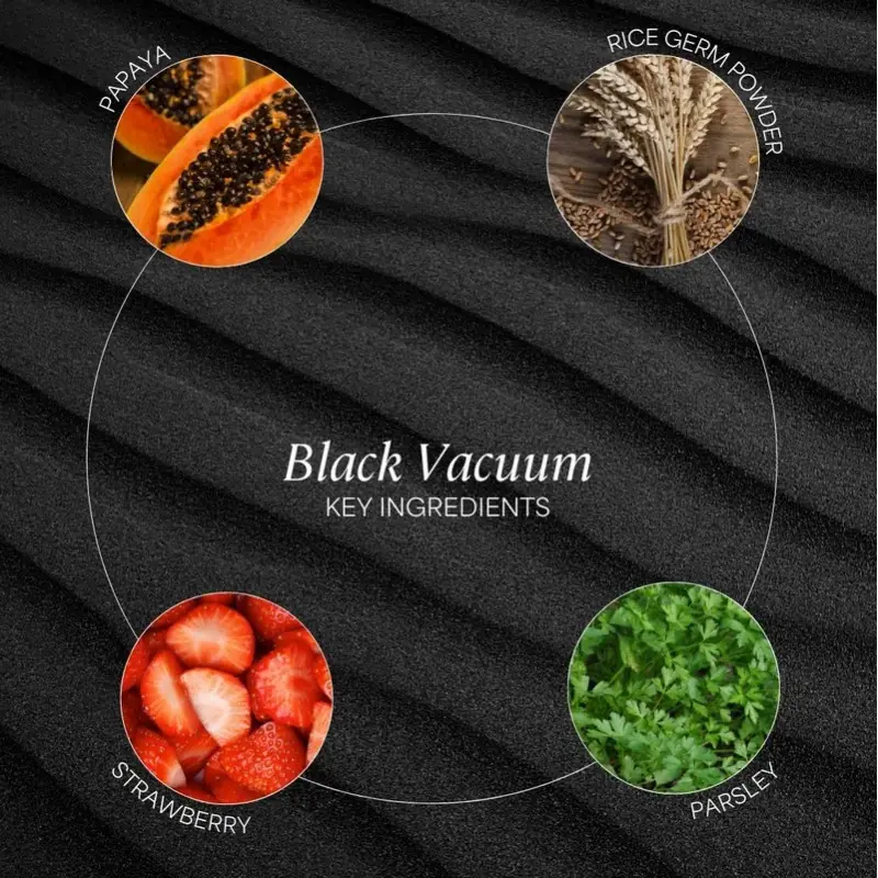 Las tabletas BLACK VACUUM, están principalmente compuestas de enzimas de germen de arroz, complementadas con extractos naturales de frutas y verduras. Contienen enzimas y nutrientes complejos de alta actividad, como enzimas de piña y bacterias lácticas. La fermentación durante más de tres años y en tres etapas permite que las enzimas alcancen un nivel de refinamiento que las hace altamente biodisponibles y activas, otorgando a esta mezcla líquida una potencia excepcional y un sabor delicioso. Aporta una amplia gama de vitaminas, minerales y otros nutrientes esenciales.